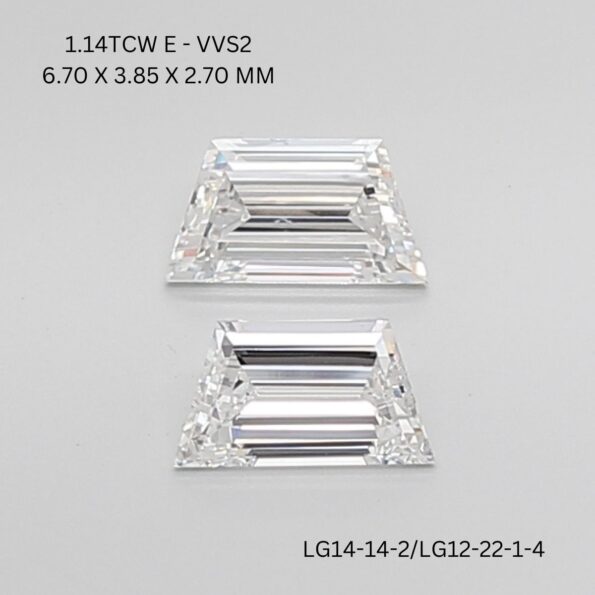 Magnificent 1.12 carat matched diamonds in E color and VVS2 clarity. Trapezoid step cut (6.7×3.85mm) creates dazzling sparkle. Sustainable alternative for high-end jewelry.